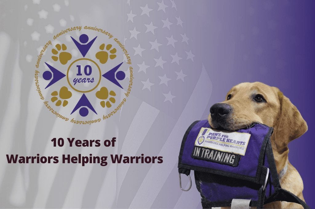 Paws for Purple Hearts is proud to celebrate 10 years of improving the lives of Veterans and Active Duty Service Members facing mobility challenges and trauma-related conditions. Over the past few years Paws for Purple Hearts has expanded to five facilities across the US, deployed 128 dogs, and directly improved the lives of over 10,000 Warriors. It all started as a research program at the prestigious Bergin College of Canine Studies, conducted in partnership with the VA Palo Alto Health Care System team in Menlo Park, CA. The program involved an innovative therapeutic model in which Warriors received therapeutic benefit that helped reduce their PTSD symptoms through participation in sessions during which they trained and prepared service dogs for their fellow injured Warriors. This method is now known as Canine-Assisted Warrior Therapy®, and our motto is “Warriors Helping Warriors®” because of this concept. As the program built momentum and became more widely known, the demand for our therapy and top-notch dogs grew. In response to this demand, and to allow us to focus better on the important mission, we established Paws for Purple Hearts as an independent nonprofit which was officially recognized on June 29, 2011.