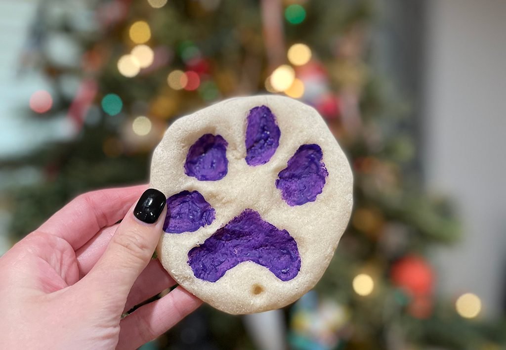 Looking for an extra, fun tip to make your ornament even better? Try gently lifting the opposite leg of the paw in the salt dough and more weight will be put onto the paw being printed! This will help show off your dog’s paw even more and leave you with clearer results.