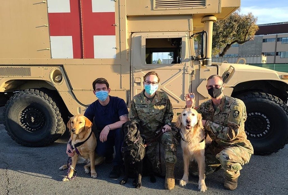 We also were able to visit with the National Guard and California Emergency Medical Services Authority staff on the frontlines of the COVID-19 outbreak response. Hoping to provide a moment to decompress, we provided social therapy to hospital staff and members of the National Guard. According to MilitaryTimes, as many as 28,000 troops have been called across the nation to assist efforts to respond, mitigate and control the COVID-19 pandemic. They are working around the clock to care for individuals, providing enhanced care capacity and building medical field hospitals.