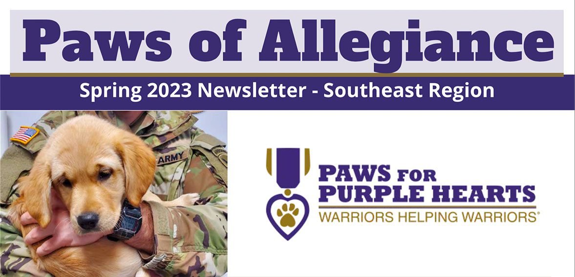 PAWS OF ALLEGIANCE SPRING 2023 – SOUTHEAST REGIONAL UPDATES PPH Newsletter Apr 26 Written By PPH Staff Here’s our latest ‘Paws of Allegiance’, a Paws for Purple Hearts Newsletter.Click Here to Download Our Newsletter PPH Staff