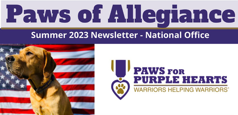 PAWS OF ALLEGIANCE SUMMER 2023 – NATIONAL UPDATES PPH Newsletter Aug 10 Written By PPH Staff Here’s our latest ‘Paws of Allegiance’, a Paws for Purple Hearts Newsletter.Click Here to Download Our Newsletter PPH Newsletter PPH Staff