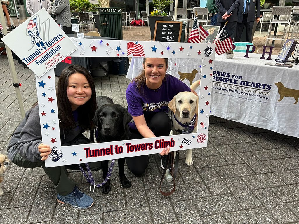 How would you like to start your Sunday by climbing 765 stairs? Paws for Purple Hearts said “Sign me up!” Our dogs showed their support for our Veterans and First Responders on April 30th at Tunnel to Towers’ Stair Climb Event in Charlotte, NC. Assistance Dog-In-Training, Jeanette; Ambassador Dog, Delta; National Client Manager, Casey; and Program Instructor, Mami climbed 43 floors in remembrance of the climb our first responders made at the World Trade Center on September 11, 2001.