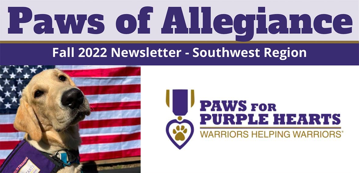 PAWS OF ALLEGIANCE FALL 2022 – SOUTHWEST REGIONAL UPDATES PPH Newsletter Nov 22 Written By PPH Staff Here’s our latest ‘Paws of Allegiance’, a Paws for Purple Hearts Newsletter.Click Here to Download Our Newsletter PPH Staff